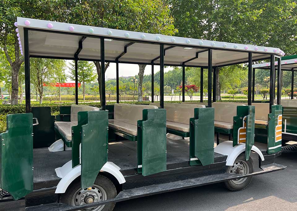 A 42-passenger trackless sightseeing train with a unique green and vintage yellow color scheme. The body is made of fiberglass and steel to ensure durability and stability. The train is equipped with leather seats, which are both comfortable and luxurious. Stainless steel handrails provide passengers with a safe and secure grip. There are bright LED colored lights around the roof, adding a charming and festive atmosphere, especially when riding in the evening or at night. This eye-catching train is not only a means of transportation, but also a moving attraction, allowing passengers to enjoy the surrounding scenery in a stylish and comfortable way while passing through parks, resorts or other scenic areas.