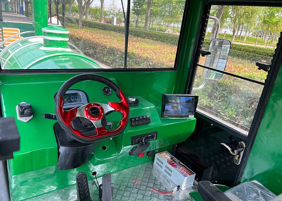 The 42-seat trackless sightseeing train is painted in a combination of green and white. The body of the train harmoniously blends the two colors. The green part represents the vitality and freshness of nature, while the white part adds a sense of elegance and purity. The seats in the train are neatly arranged to provide passengers with a comfortable viewing experience. The overall design of the train is not only eye-catching, but also provides a pleasant and relaxing journey when passing through various scenic spots, allowing passengers to fully appreciate the surrounding beauty.